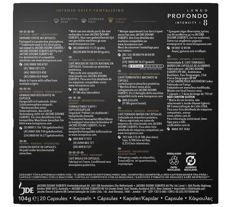 Les capsules Lungo Profondo aux notes épicées , d’amandes grillées et de réglisse . Ses notes savoureuses et complexes sont accompagnés d’une mousse chatoyantes aux nuances de bronze.