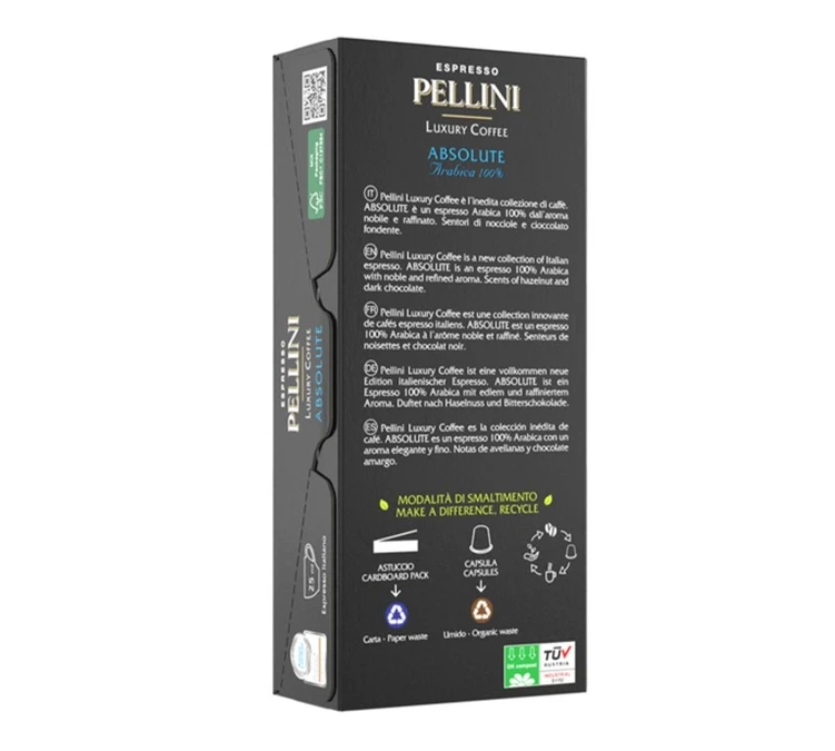 Découvrez ces 50 capsules Pellini Absolute compatibles Nespresso®. Ce mélange d’Arabicas vous offrira un espresso à la fois corsé et raffiné, aux notes gourmandes et aux senteurs de noisette et de chocolat noir.