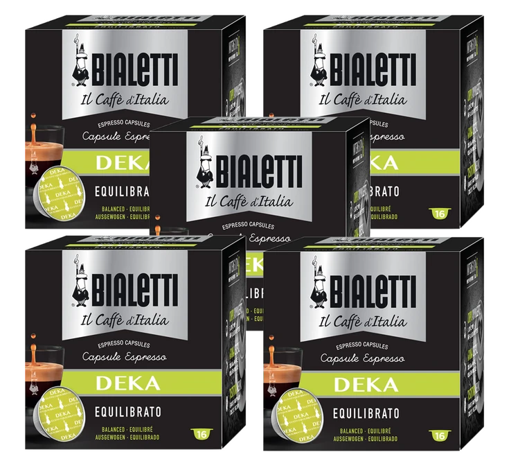 80 capsules Mokespresso de Bialetti en aluminium de café décaféiné pour les nouvelles machines de la marque. Conditionnement : 5 boîtes de 16 capsules.