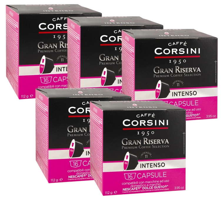 Découvrez ces capsules compatibles Nescafe® Dolce Gusto® Intenso de Caffè Corsini composées d’un mélange de cafés à l’intensité forte . Vous aurez un expresso aromatique et terriblement intense. Conditionnement : 5 boîtes de 16 capsules pour machines Nescafe® Dolce Gusto®. Livraison gratuite !