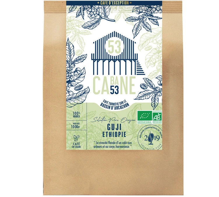 Découvrez le café en grains bio Guji de Cabane 53, un 100% Arabica d’Ethiopie. Un café de spécialité torréfié par la meilleure torréfactrice de France offrant une tasse avec une vivacité florale et un corps harmonieux. Conditionnement : 1kg.
