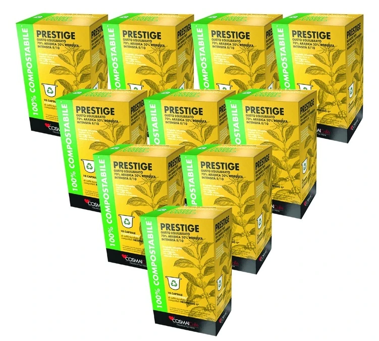 Ces 100 capsules compostables Prestige proviennent de la marque Cosmaï Caffé . Recevez 10 boîtes de 10 capsules compatibles Nespresso® d’une intensité équilibrée à la saveur gourmande . Laissez-vous tenter par la qualité de ces capsules Cosmaï Caffé !