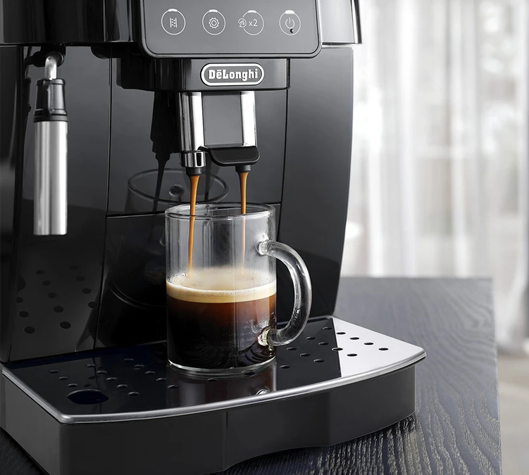 La Gamme de machines à café à grain DeLonghi Magnifica se réinvente avec les Magnifica START. Sa carrosserie en ABS noire est rehaussée par des touches d’inox, notamment sur la buse vapeur.