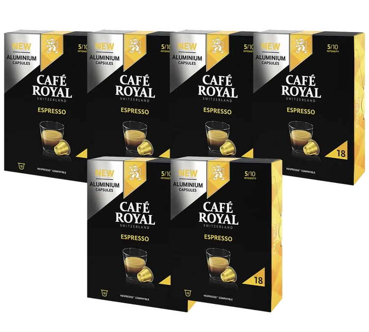 Découvrez ces capsules Café Royal Espresso compatibles avec toutes les machines Nespresso®. Ces capsules compatibles Nespresso® composées d’un mélange d’Arabica vous offriront un expresso équilibré avec une légère note de curcuma. Capsules en aluminium pour préserver les arômes et la fraîcheur. Conditionnement : 6 boîtes de 18 capsules.
