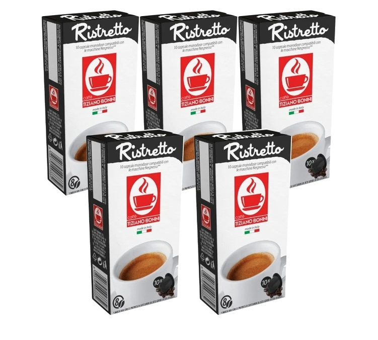 Découvrez ces capsules Ristretto compatibles avec toutes les machines Nespresso® . Ces capsules compatibles ® sont dediées à tous les amateurs de café italien à l’aôme puissant avec une fin de bouche persistante. Conditionné en 5 paquets de 10 capsules.