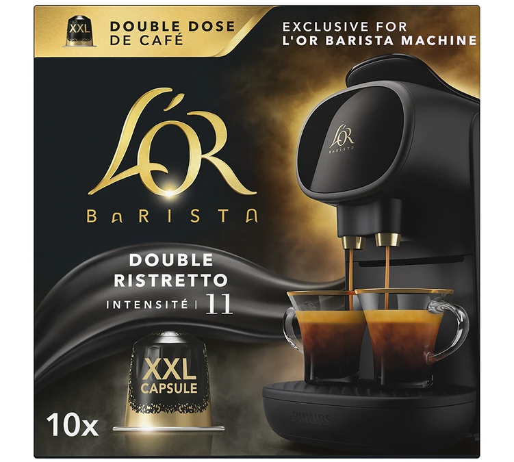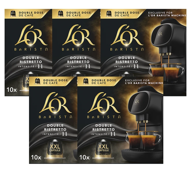 Découvrez les capsules XXL Double Ristretto de l’Or Barista, expresso à l’intensité franche, au caractère expressif et vif et aux notes épicées, idéal en fin de repas. Réalisez soit deux expressi intenses ou un double expresso puissant avec une seule capsules. Capsules compatibles avec les machines L’Or Barista. Conditionnement : 5 boîtes de 10 capsules.