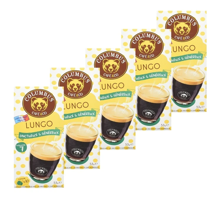 Découvrez ce lot de 50 capsules compatibles Nespresso® Lungo de Columbus Café & Co. Ce café allongé est idéal pour bien commencer la journée avec ses notes florales. Ces capsules sont 100% hermétiques, sans emballage superflu, conditionnées par boîte de 10.