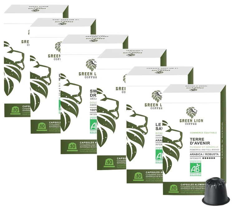 Découvrez ces capsules compatibles Nespresso® Cafés Green Lion grâce à ce pack découverte de 60 capsules de 6 cafés différents. Ces capsules compatubles Nespresso® sont idéales pour les amateurs de café. Les capsules en aluminium garantissent une fraîcheur et un café de qualité en tasse !