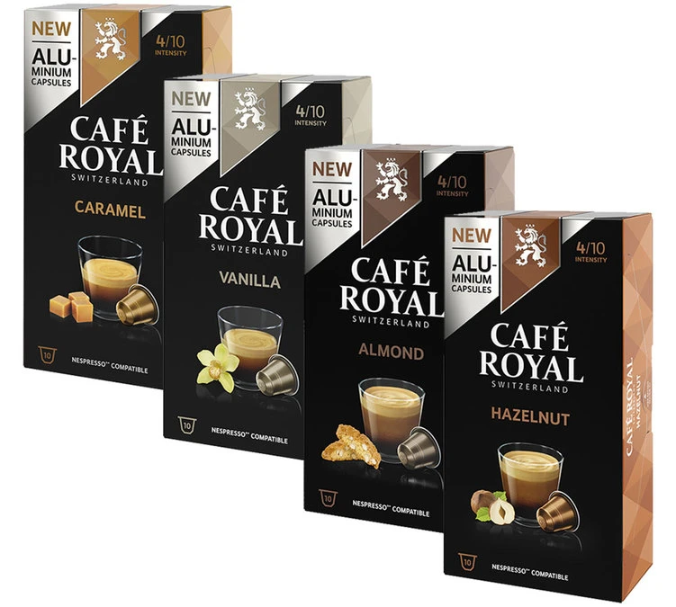 Laissez vous tenter par les capsules aromatisées en aluminium de Café Royal. Cette offre découverte comprend les saveurs suivantes : Vanille, Noisette, Amande et Caramel. Capsules compatibles avec les machines à capsules Nespresso®. Conditionnement : 4 boîtes de 10 capsules.